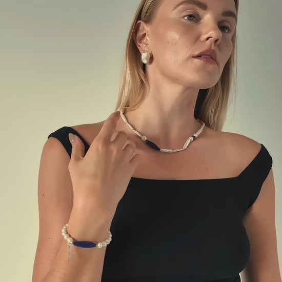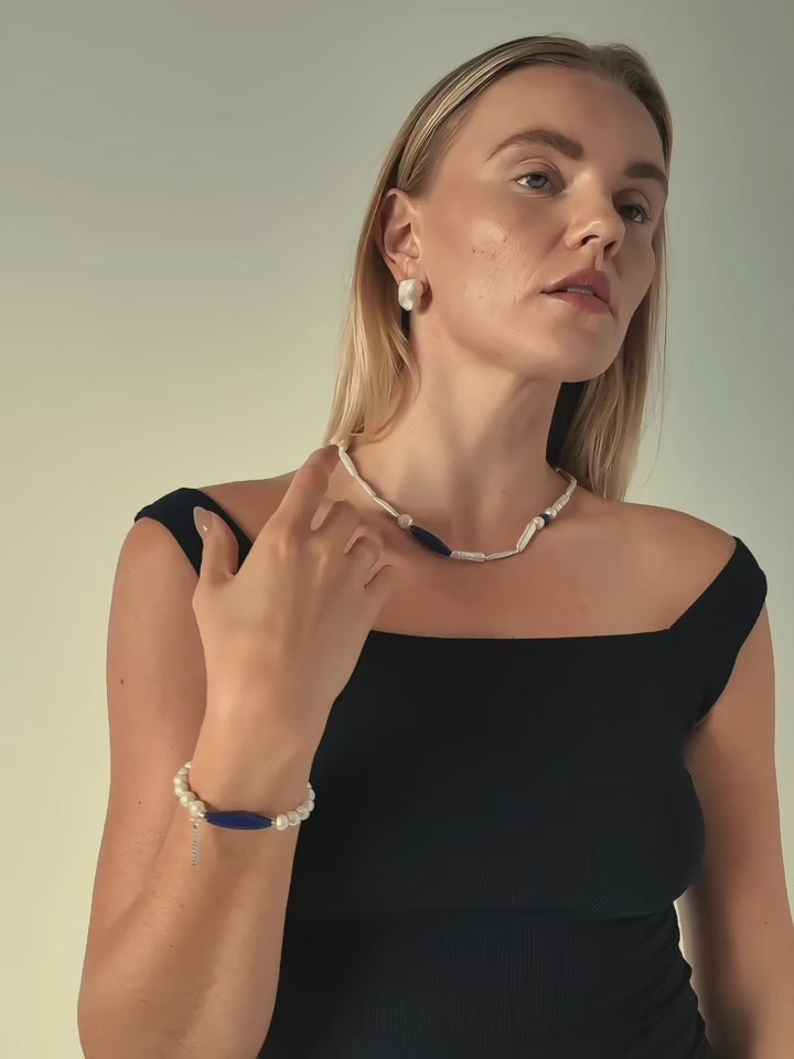 Stones: natural baroque and tube freshwater pearls, Afghan lapis barrel beads and sodalite accents (Water‑led blend with Wood and Metal support), bringing together emotional calm, gentle flow and clear presence.