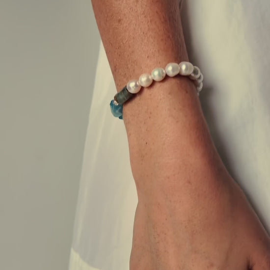 Stones: natural amazonite (main Water element), paired with creamy freshwater pearls for softness and comfort.
